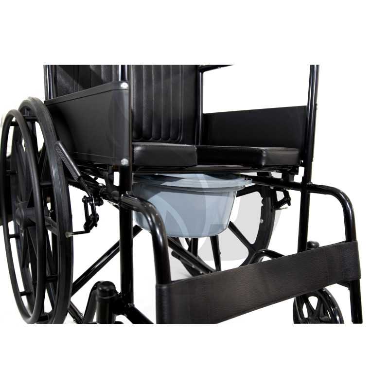 Estructura de la silla plegable (una vez retirado el asiento e inodoro). Mango ergonómico para empuje de silla. Marco de acero inoxidable recubierto en polvo. Reposabrazos fijo con almohadilla. Espaldar de cuero sintético. Bolsillo en la parte posterior del espaldar. Asiento de cuero sintético con tapa desmontable en forma de U. Inodoro plástico desmontable. Palanca de freno en ambas ruedas. Ruedas neumáticas, con aros de empuje manual. Reposa pantorrillas de lona con ajuste tipo velcro. Reposapiés fijo y abatible. Carga máxima 100kg.