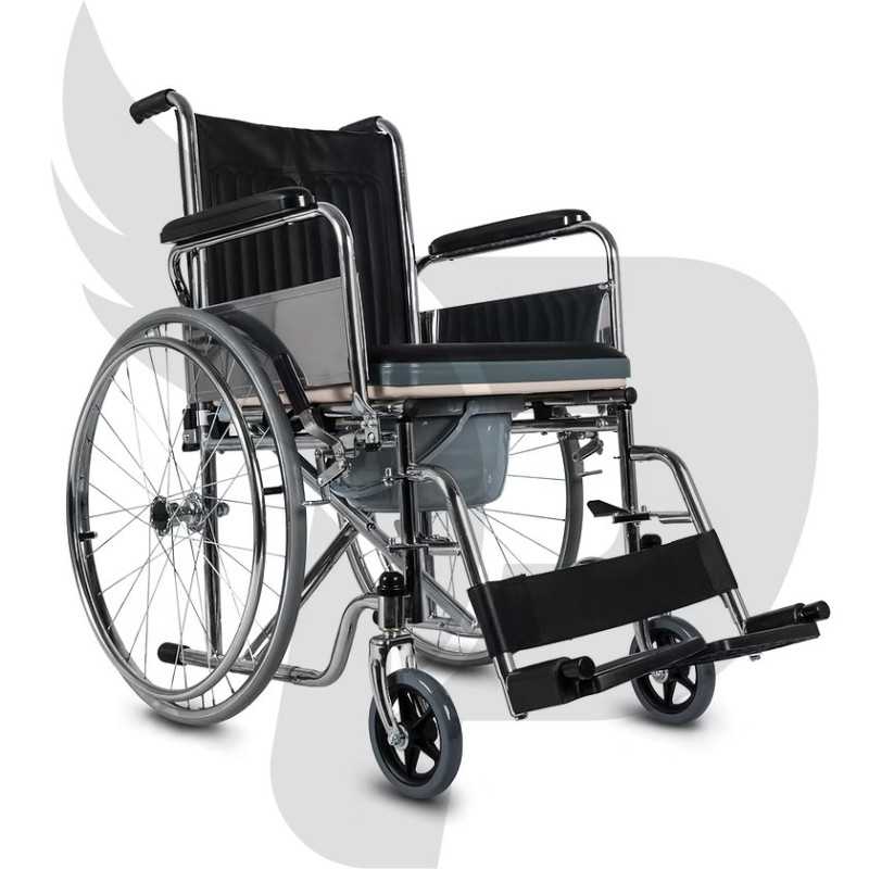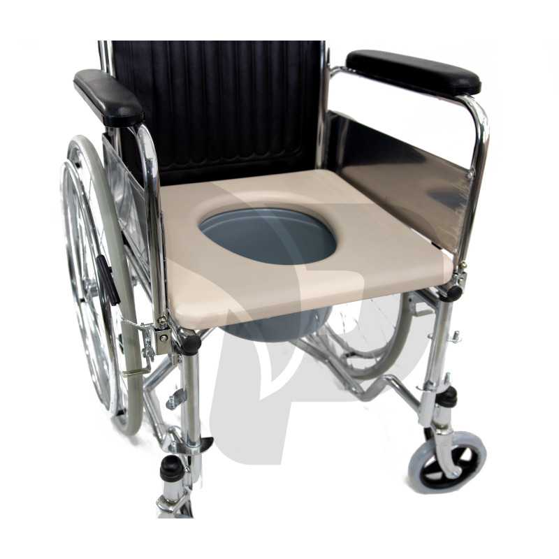 Estructura de la silla plegable (una vez retirado el asiento e inodoro). Mango ergonómico para empuje de silla. Marco de acero inoxidable recubierto en polvo. Reposabrazos desmontable con almohadilla. Espaldar de cuero sintético. Bolsillo en la parte posterior del espaldar. Asiento de cuero sintético con tapa desmontable en forma de U. Inodoro plástico desmontable. Palanca de freno en ambas ruedas. Ruedas neumáticas, con aros de empuje manual. Reposa pantorrillas de lona con ajuste tipo velcro. Reposapiés fijo y abatible. Carga máxima 100kg.
