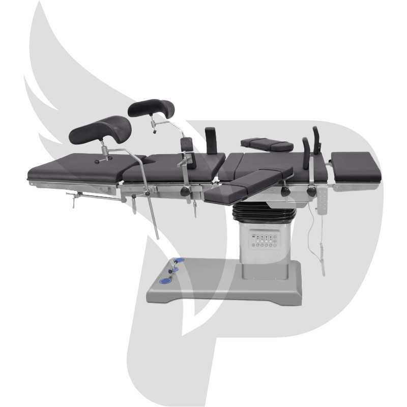 Material: Estructura de acero inoxidable. Largo: 190cm. Ancho: 52cm. Dividida en cinco secciones. Panel de control en base comprimida. Base con colchonetas de espuma recubiertas de polipropileno. Permite realizar tomas de RX. Movimiento superior deslizante longitudinal mediante control remoto. Bloqueo de piso por control remoto. Deslizamiento de la parte superior hacia adelante y atrás 5. Inclinación lateral de izquierda a derecha. Partes de la mesa de operaciones: Reposacabezas, apoya hombros, puente de riñón, pierneras, respaldo, reposa piernas.