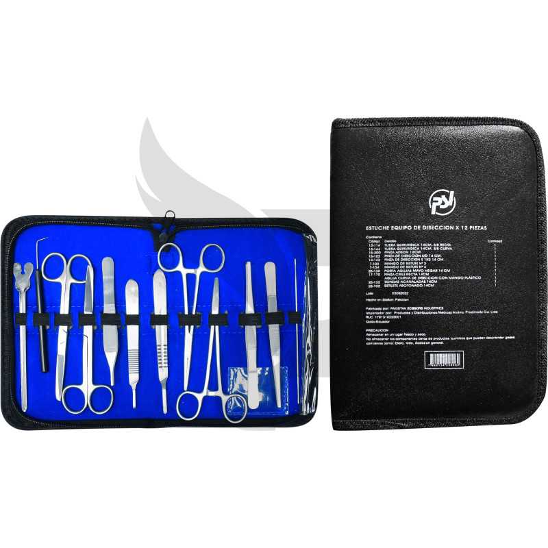 Largo: 21cm. Ancho: 24.5cm. Estuche de cuero, kit de acero inoxidable mate. Método de esterilización a vapor 134°, estufa o autoclave. Contenido: Tijera recta roma 14cm. Tijera curva roma 14cm. Pinza Adson 12cm. Pinza de disección con diente 14cm. Pinza de disección sin diente 14cm. Mango de bisturí N° 3. Mango de bisturí N° 4. Porta agujas 14cm. Pinza crile recta 14cm. Aguja curva de disección con mango plástico 14cm. Sonda anacalada 14cm. Estilete abotonado 14cm.