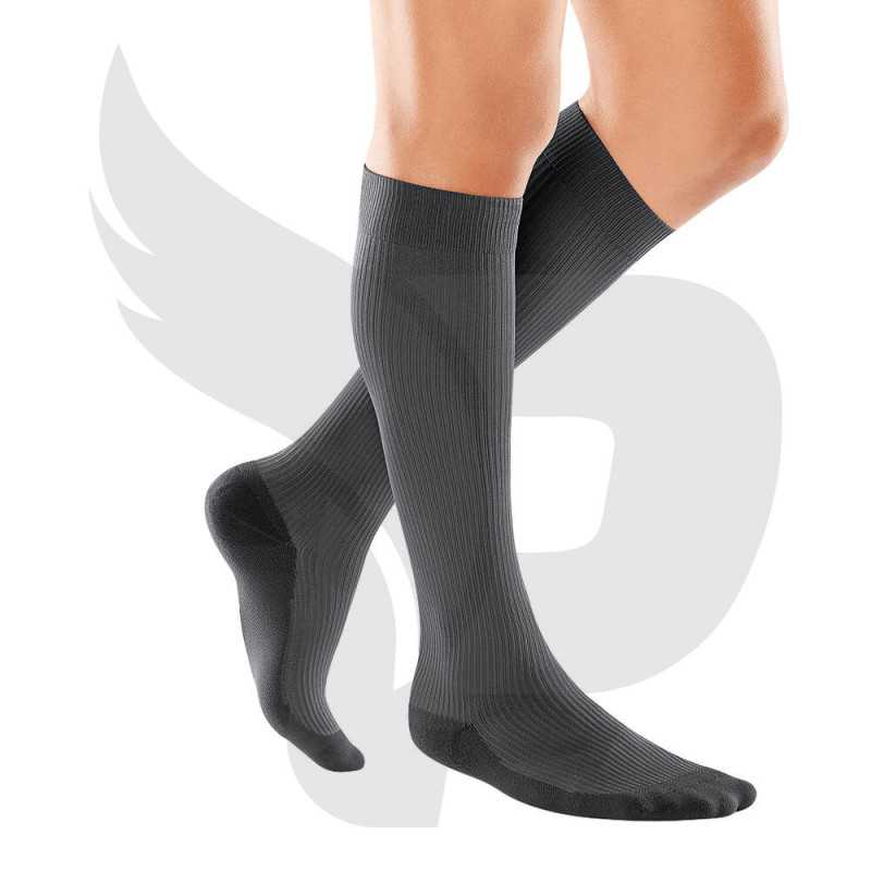 Calcetín de viaje clínicamente probado con planta de pie acolchada para máximo confort, compresión de 8-15mmHg. Diseño moderno y elegante. Tallas: S, M, L, XL, XXL. Presentación: Par, para pantalón (hasta la rodilla). Colores: negro, gris. Tipo de punta: punta cerrada. Elaborada en poliamida y tejido de elastano. Compresión graduada. Sistema clima fresh que inhibe cualquier tipo de olor en la media, sistema clima confort que garantiza la comodidad durante el uso constate de la media. Forma anatómica. Hipoalergénica. Libre de látex. No estéril. Reusable (en el mismo paciente).