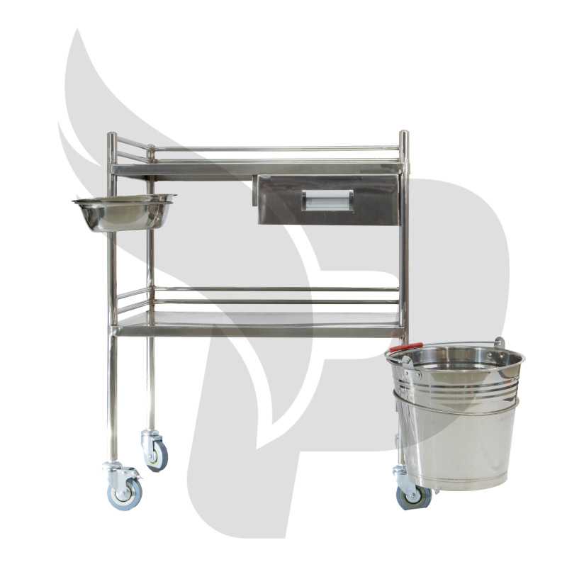 Material: Estructura de acero inoxidable cromado y filos de ABS. Largo: 65cm. Ancho: 48cm. Alto: 97cm. Equipado con dos bandejas: superior con cajón e inferior lisa con reborde. Barandillas de seguridad en ambos niveles. Acabado con parachoques en cada esquina. Accesorios (bandeja y cubeta) sujetos por un soporte tipo anillo giratorio. Cuenta con 4 ruedas giratorias cada una con freno. De alta resistencia y fácil limpieza.