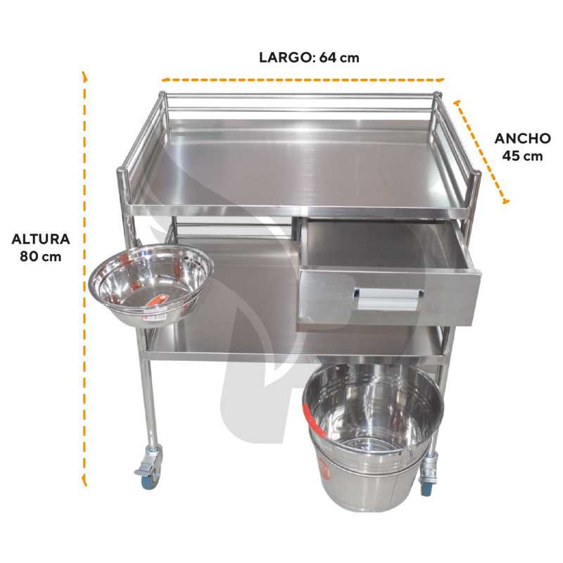 Material: Estructura de acero inoxidable cromado. Largo: 64cm. Ancho: 45cm. Alto: 80cm. Equipado con dos bandejas: superior con cajón e inferior lisa con reborde. Barandillas de seguridad en ambos niveles. Accesorios (bandeja y cubeta de 9lts con aza) sujetos por un soporte tipo anillo giratorio. Cuenta con 4 ruedas giratorias con freno en las 2 ruedas posteriores. De alta resistencia y fácil limpieza.