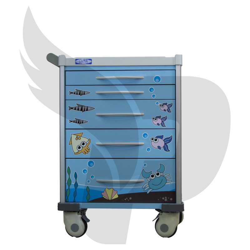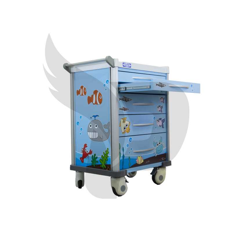 Material: Estructura de aluminio y cubierta de ABS. Ancho: 67.5cm. Profundidad: 50cm. Alto: 100cm. Diseño animado. Cinco cajones con divisiones internas. Cajones con rieles de auto retorno. Parachoques resistente a impactos. Sistema de cierre central. Mesa lateral de trabajo deslizante. Cuenta con 4 ruedas giratorias de 12cm de diámetro cada una con freno. De alta resistencia y fácil limpieza.
