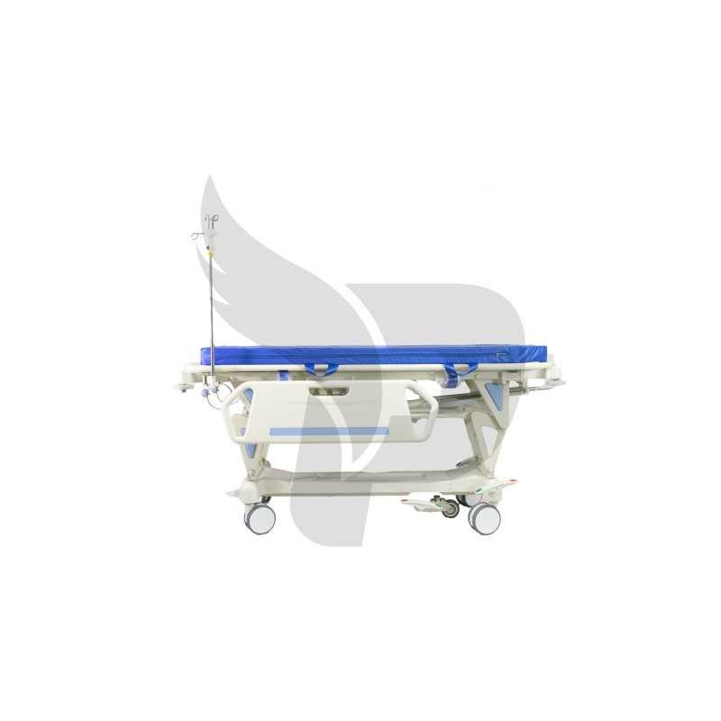 Material: Estructura de acero inoxidable y cubierta de ABS. Largo: 192cm. Ancho: 61cm. Alto: 102cm. Capacidad de peso: 180 kg. Acción para cambio de posición manual (tanto en espaldar como para altura). Sistema hidráulico. Parachoques resistente a impactos. Porta sueros regulable. Barandillas plegables. Incluye colchoneta impermeable con cubierta de lona impermeable. Sistema de freno central. Cuenta con 4 ruedas de 15cm cada una con freno. De alta resistencia y fácil limpieza.