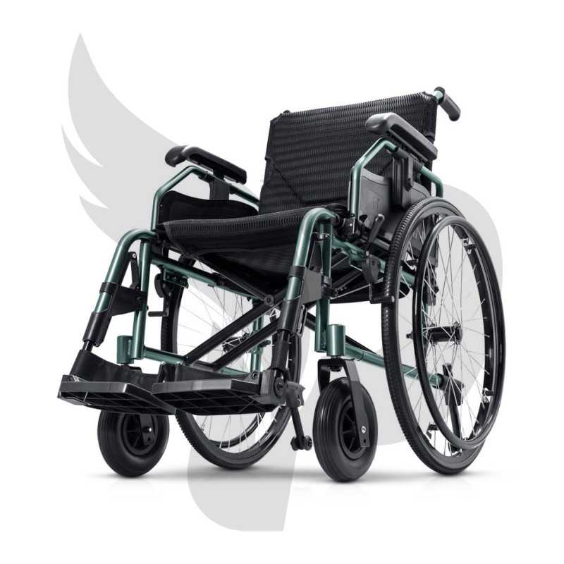 Estructura de la silla plegable y liviana. Mango ergonómico para empuje de silla. Marco de aluminio. Reposabrazos abatible y regulable con almohadilla de poliuretano. Espaldar y asiento de nylon impermeabilizado negro resistente con cojín acolchado de tela sintética con velcro para fácil lavado. Bolsillo en la parte posterior del espaldar. Palanca de freno en ambas ruedas. Ruedas neumáticas, con aros de empuje manual. Cuenta con dos ruedas de soporte antivuelco en la parte posterior de la silla. Reposa pantorrillas de nylon negro. Reposapiés abatible y desmontable. Carga máxima 100kg.