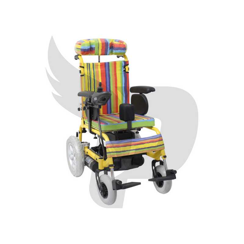Estructura de la silla no plegable. Diseño pediátrico. Silla de ruedas eléctrica con controlador mediante palanca. Mango ergonómico para empuje de silla. Marco de aluminio recubierto en polvo. Reposacabezas acolchado, moldeable y desmontable. Reposabrazos desmontable y regulable con almohadilla de poliuretano. Espaldar acolchado. Bolsillo en la parte posterior del espaldar. Cinturón de seguridad para torso y cintura ajustable. Asiento con cojín acolchado. Soporte metálico en piernas para evitar caídas. Palanca de freno en ambas ruedas. Ruedas neumáticas. Cuenta con dos ruedas de soporte antivuelco en la parte posterior de la silla. Reposa pantorrillas de lona con ajuste tipo velcro. Reposapiés fijo.