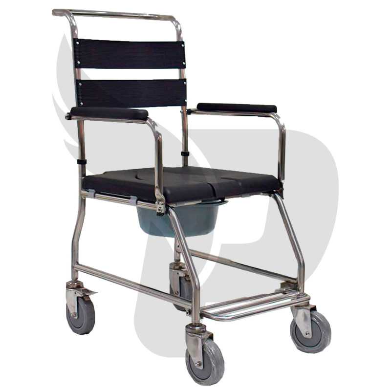 Estructura de la silla plegable hacia adelante. Mango ergonómico para empuje de silla. Marco de acero inoxidable recubierto en polvo. Reposabrazos abatible con almohadilla. Espaldar de cuero sintético. Bolsillo en la parte posterior del espaldar. Asiento de cuero sintético con tapa desmontable en forma de U. Inodoro plástico desmontable. Ruedas neumáticas, con aros de empuje manual y bloqueo en las dos ruedas traseras. Reposa pantorrillas de lona con ajuste tipo velcro. Reposapiés fijo. Carga máxima 100kg.
